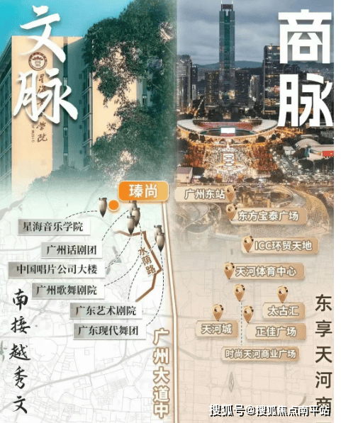 文化与商业交汇点:『瑧尚』地处越秀和天河交界处,既享有深厚的文化底蕴,又坐拥天河商圈的繁华。项目南端的水荫路,自上世纪70年代以来一直是广州文化艺术的重要地标,汇聚了多家文化艺术机构,如广州歌舞剧院、星海音乐学院等,营造了浓厚的艺术氛围。