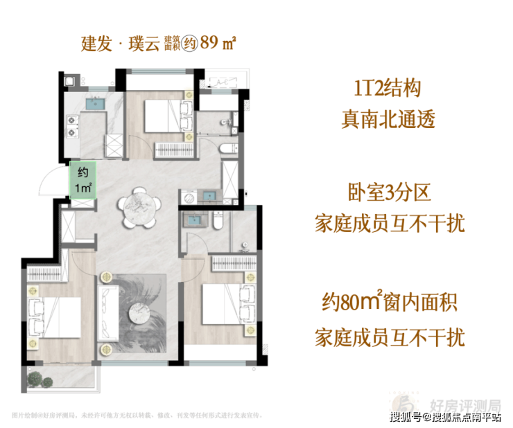 而璞云89㎡ ,从格局看,1T2结构,保障对南北通透的追求;从窗内面积看,达到了约80㎡,相较传统同面积高层,多了约20㎡!