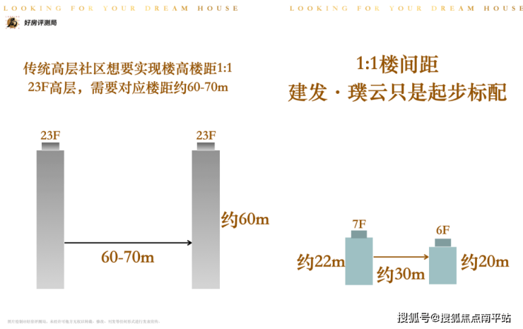 此次建发璞云楼间距都在30m左右,全社区以6F-7F-10F从低到高排布,首排楼栋总高仅约20m上下,楼距约1:1。