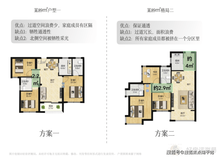 以往90㎡产品,主流采用以下两种布局,格局各有取舍,普遍窗内面积在60㎡左右。