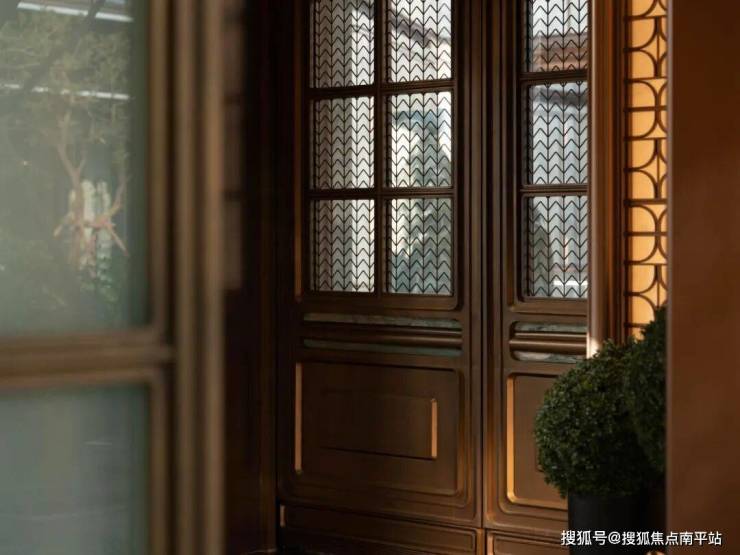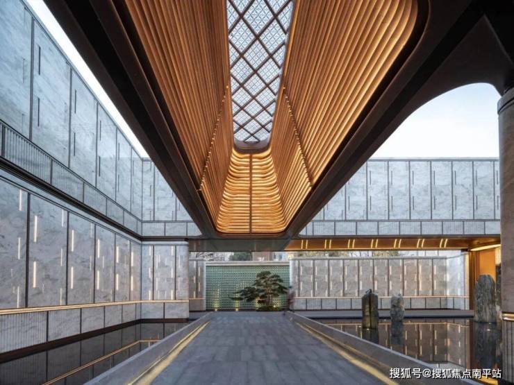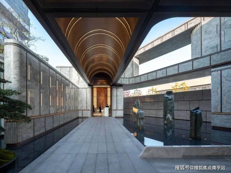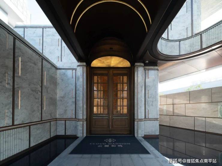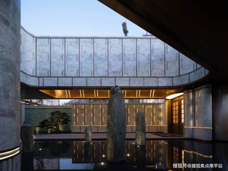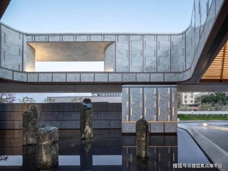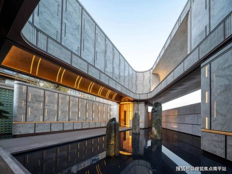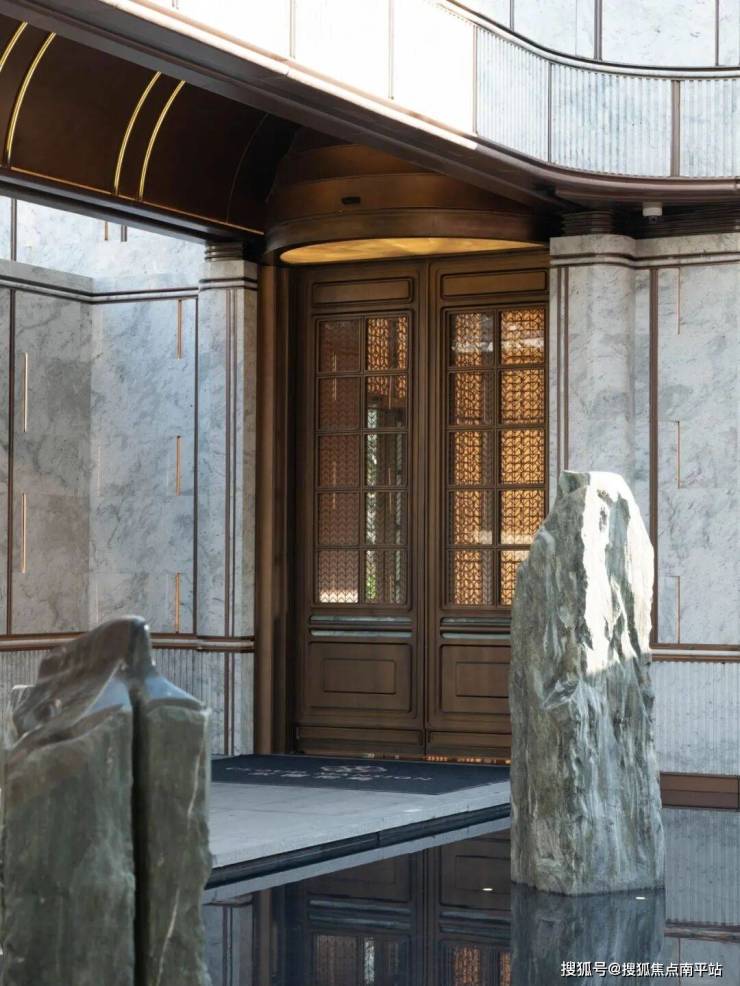 主入口以宝匣启玉为灵感,巧妙地运用弧形线条勾勒出云的灵动与写意,大面积铺设的皇家翠玉石材温润通透,静水前院倒映天光云影,瞬间便隔绝了外界的浮躁。