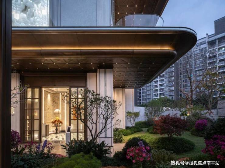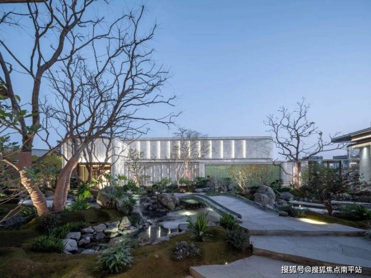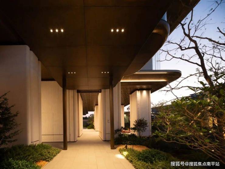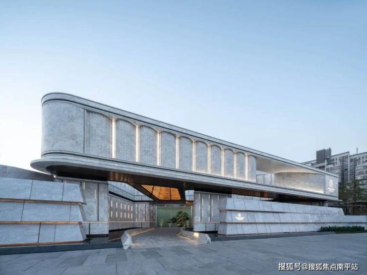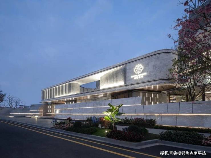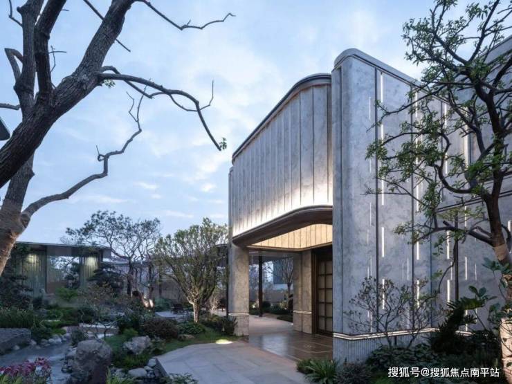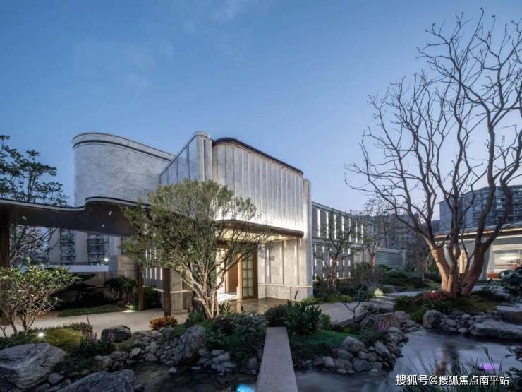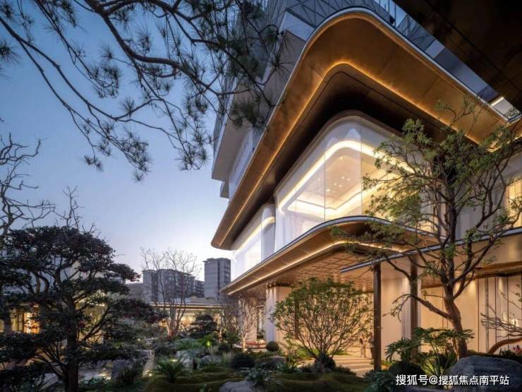 建筑立面以柔和舒展的曲线与庭院景致相互映衬,在灯光映照下呈现出温润而轻盈的表情。