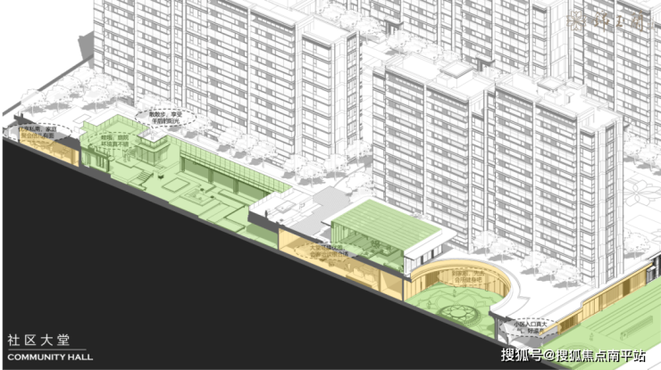 在超级底盘下,结合功能及实际使用需求,塑造了不同的城市界面。架空平台边界就不是5米多高的森严“硬边界”,而是更有烟火气的“软边界”。配套功能沿东侧道路展开,由绿谷延伸至社区内部,大量室内外过渡空间,营造多层次空间体验。东西向归家礼仪轴线,多层级下沉庭院与架空平台形成立体街巷,成为由城市的喧嚣到社区清净的生态绿谷。