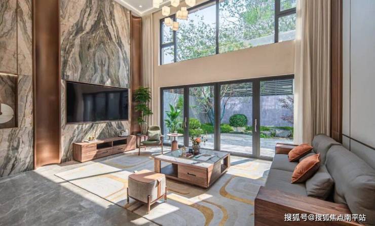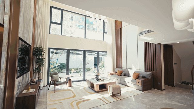 内部以洄游动线串联各功能区,挑高 4.5 米的开阔格局搭配大面积玻璃幕墙,让庭院景观与室内空间无界渗透,形成 “园中有厅,厅藏园景” 的交融意境,完美诠释了海派生活的雅致与通透。