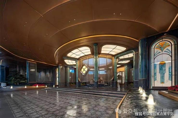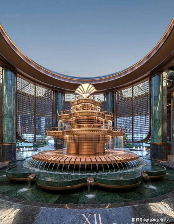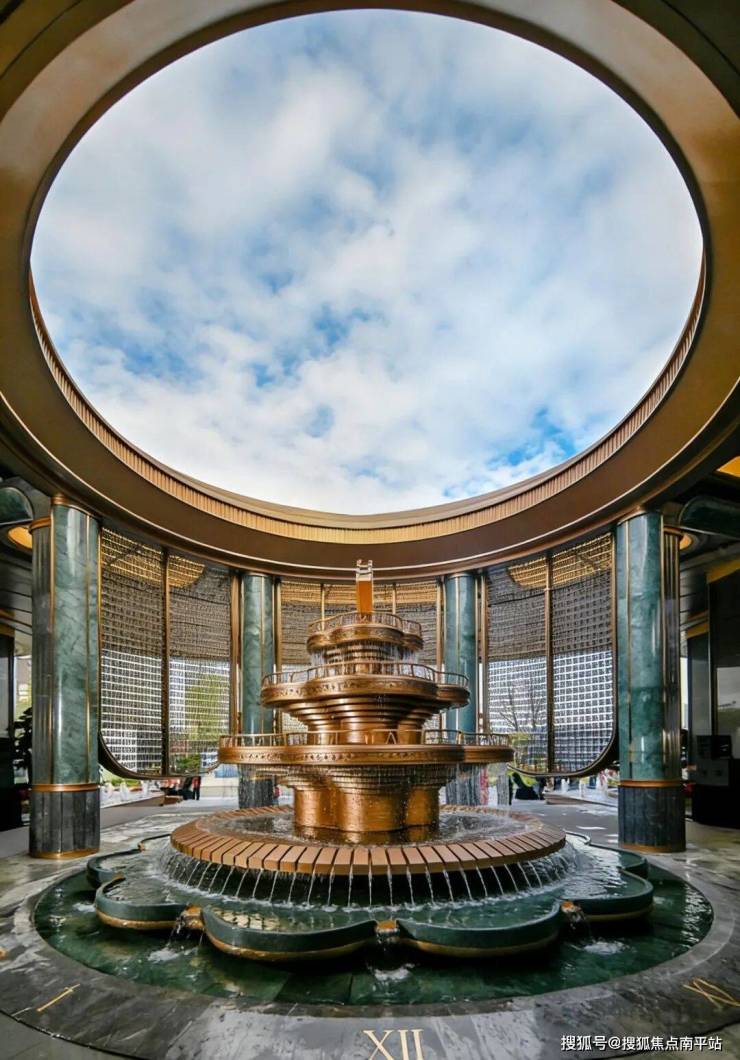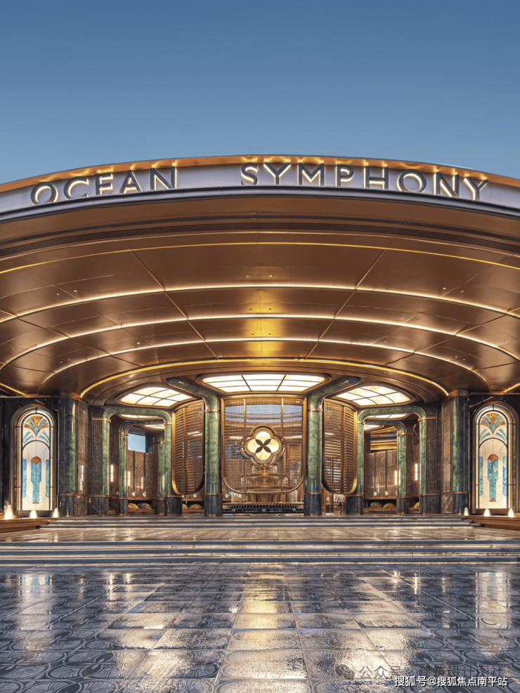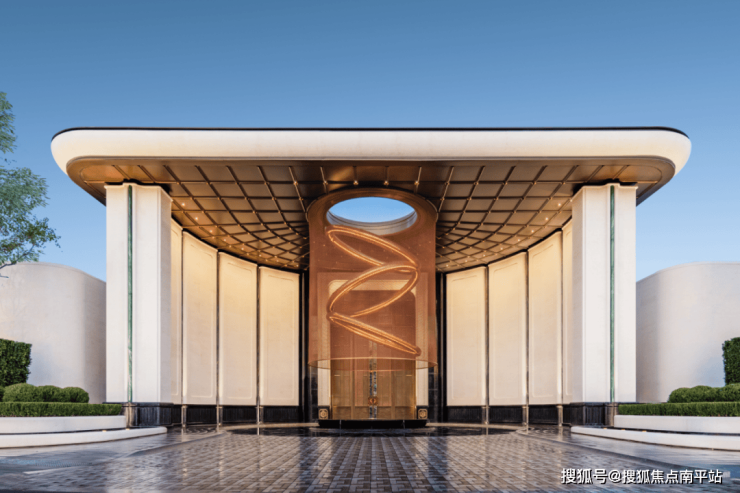 入口设计复刻鼓浪屿八卦楼的中轴对称形制,尽显经典格局与庄重感,双圆悬挑云母石鎏金穹顶灵感源自容谷别墅与客家土楼,既寓意圆满和谐,又以鎏金质感彰显高端格调。