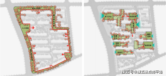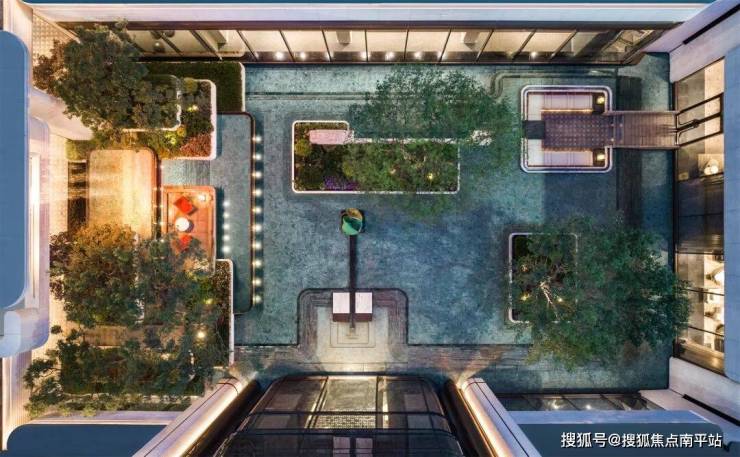 结合规划布局和架空平台进行打造,全架空体系,场地抬升5.5m,平台板按规范比例开洞,效法传统开山理水的造园手法,将仪式礼序融入园林景观,集中设置在地块中央,结合景观设计,形成一条中央绿谷,高架空平台与多层级下沉庭院形成立体街巷,全域绿化,进人尺度体验丰富。
