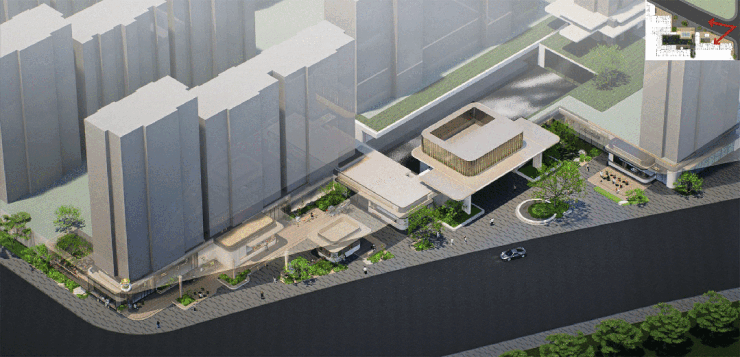 社区采用立体架空层设计,距离市政路约5.8米架起高台。架空层内设置了室内外融合的泛会所和阳光停车场。3个地块架空部分的建筑面积约9.78万㎡。