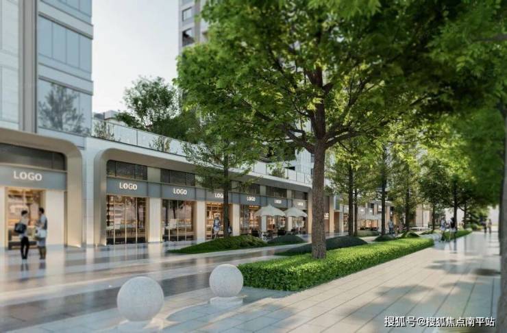 金属屋檐划分出上下「双重空间」:下是商街的烟火繁华,上是社区的静谧尊崇。整条商街可不是单一铺面的「复制+粘贴」,而是高低错落、层次进退、「一铺一面」。特别是通过连续柱廊和屋檐,模糊室内外界限,营造出大量檐下灰空间,好似「海派骑楼」。