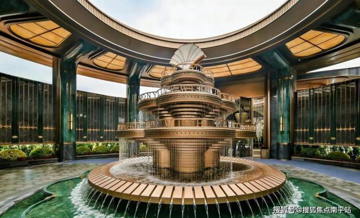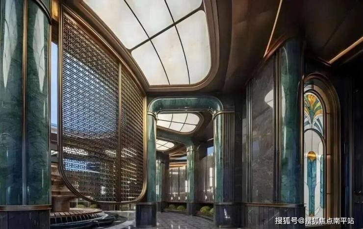 在“莫奈之窗” 下沉庭院中,项目使用了约600㎡亚马逊绿奢石通铺底面,视觉效果上,满目Tiffany蓝尽显奢华质感。