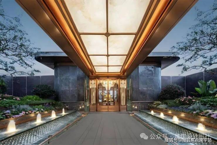 建筑立面上,从传统中式意向出发,融入流行的现代风格。利用香槟金色铝板打造的外挑屋檐,复刻中式建筑的重檐韵味,也和大门、廊架等公共部位的建筑呼应。