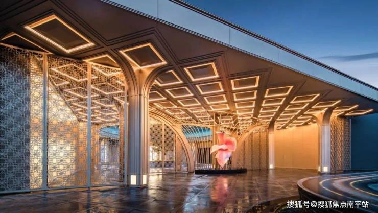 细节处,入口奢石景墙与迎客松形成层次丰富的礼仪界面,地面铺设闽南特色花砖,悬浮金属格栅融入非遗珠绣工艺,点缀海棠纹与扇形纹样,让光影穿过时洒落璀璨光景,尽显东方美学的细腻工艺。