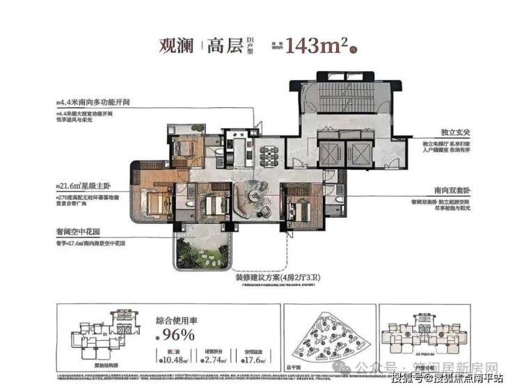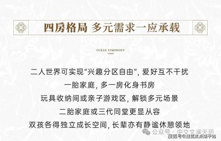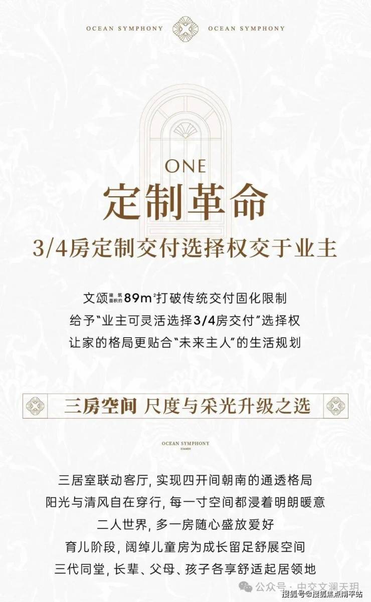 稀缺景观资源:占据集美“最后湾海景观眼”,部分户型推窗见海。中交文澜天玥A1、A3地块全系都是4房以上户型,整个厦门都罕见;125和143平,4房3卫双套卧首现厦门,非常震撼!特别是A3地块,将带来厦门第二大、岛外最大的约3000平下沉式会所,是岛外其它盘的两倍面积,又是海派南洋风格,作为集美首个高端改善产品