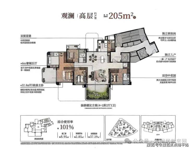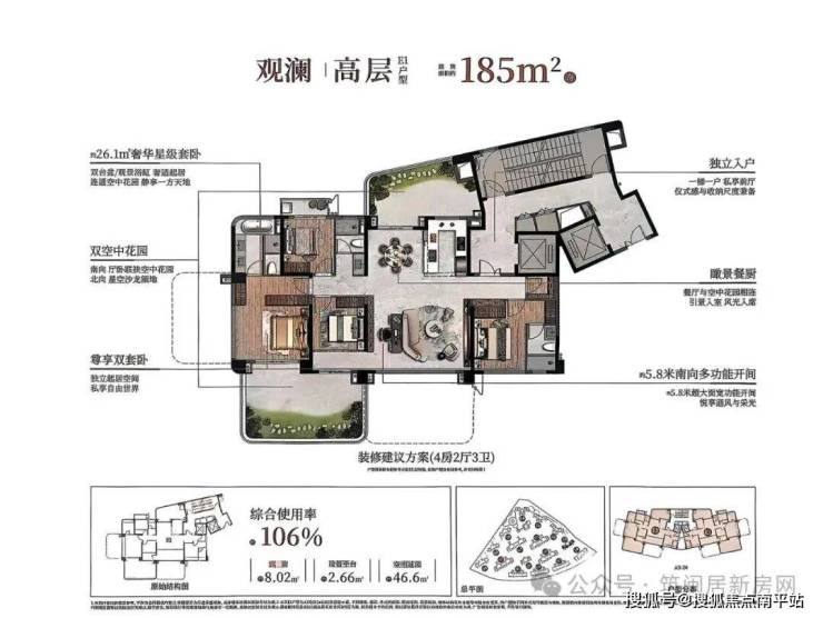108-205平,四代住宅和叠墅产品!除两栋高层,2梯3户,剩下都是一梯一户。只有108平是普通户型,其余都是四代住宅。面积段有108-127-143-185-205平,143平及以上也都是双套卧和露台,部分可以看海!185-205平大平层带瞰海双露台。岛外首个下沉式会所,配套行政酒廊、宴会厅、室内恒温泳池、健身房、瑜伽等。