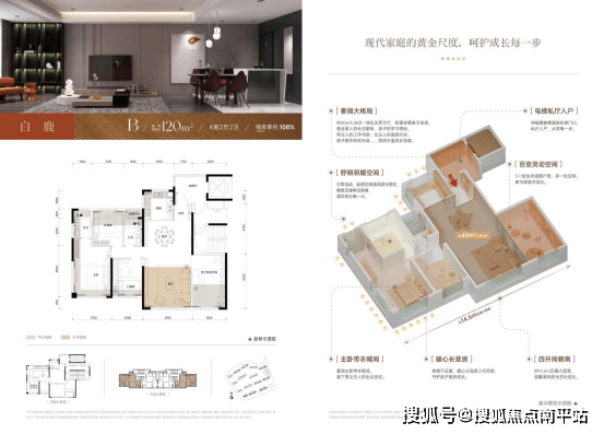 建面120㎡四房户型得房率约112%,实得面积媲美老规148㎡产品。LDKB一体化设计,满足四口之家或三代同堂的多元生活需求。