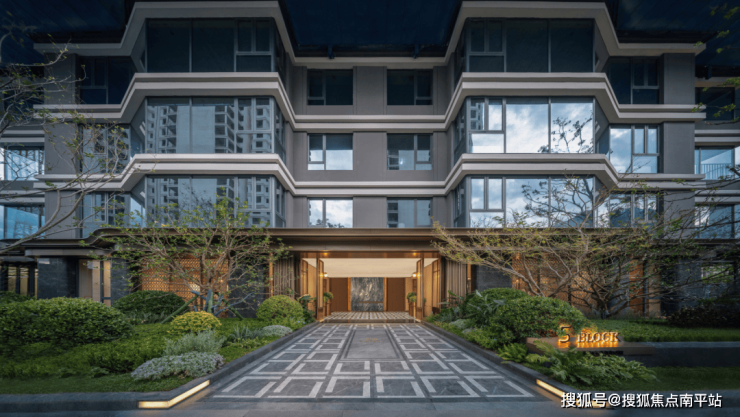 项目外立面已部分实景呈现,采用浅灰色石材与古铜色铝板筑底,强化单元门头的质感表现。