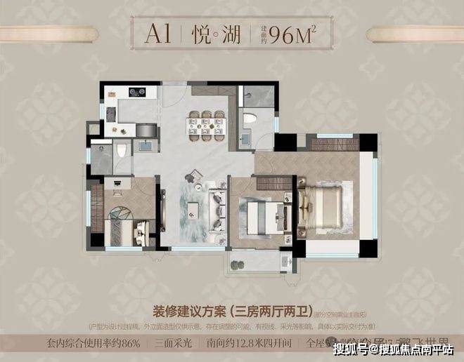 (1)空中墅理念下沉:项目西地块虽以大平层为主,但通过6.5-6.8米挑高观景阳台(约30%阳台占比)将第四代住宅的“空中庭院”概念引入中小户型。例如96㎡户型通过三面采光+12.8米南向四开间设计,实现类边套的景观视野,主卧套内面积达23㎡,媲美传统120㎡产品。