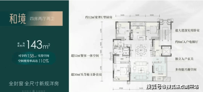 建筑面积约143㎡:实得面积约158㎡,实际得房率110%,相当于旧规186㎡。(旧规户型按85%得房率计算,仅供参考)
