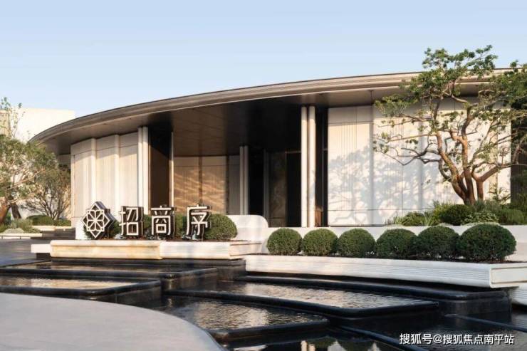 招商序在主入口界面的塑造上,突破常规住宅尺度限制。约7米高巍峨门庭伫立于中轴,长约50米的扇形雨棚通过精密弯弧工艺掠过云端。超大尺度的连续界面,以物理空间的极致开敞,赋予居者从容归家体验。