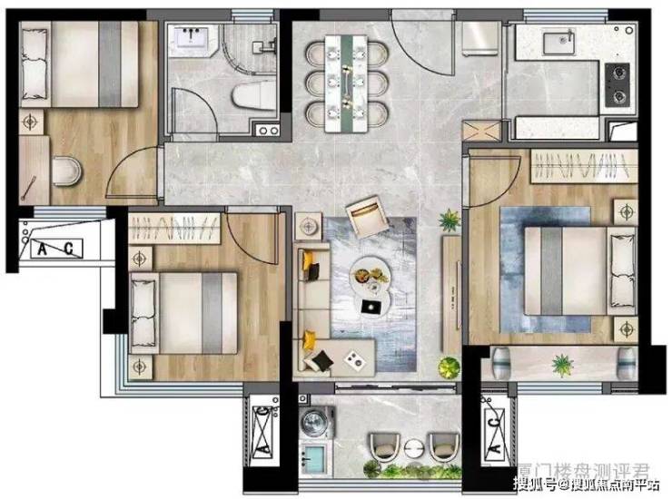 户型设计:部分户型存在隐私性和实用性问题,如卫生间和厨房窗户直接对着走廊,以及主卧门对着主卧门等问题。