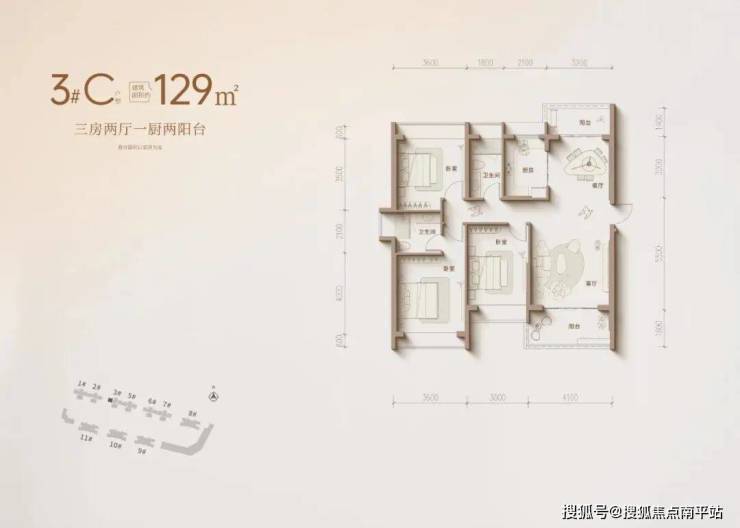 3、建面约129㎡ 三房两卫:经典改善。标准的舒适三房,双卫生间设计避免早晚高峰拥堵,房间尺度宽敞,适合大多数二胎或三代同堂家庭。