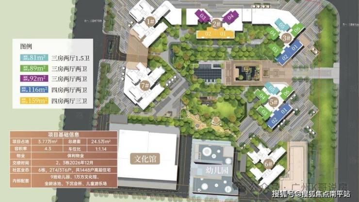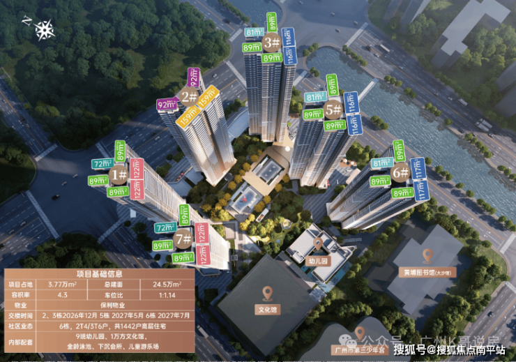 保利招商华发中央公馆采用了围合式设计,6栋47层高塔楼设计,小区自身配建有文化体育场馆和幼儿园,除了2#楼王是两梯四户,其余均为三梯六户,8#是5层高的文化馆,9#是配建3层高的幼儿园。