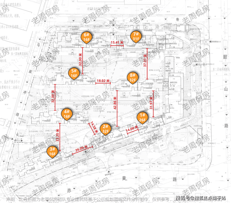 主要是东侧1#、2#、7#、8#栋为高层,高度约75-100米,这个30多米的楼间距就不够看了。