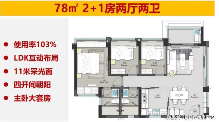 值得一提的是,特别是78㎡市面上大部分的南北对流主套,都穿过了卫浴,虽然实现了通风,但难免会有异味。
