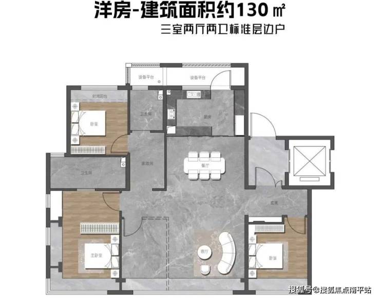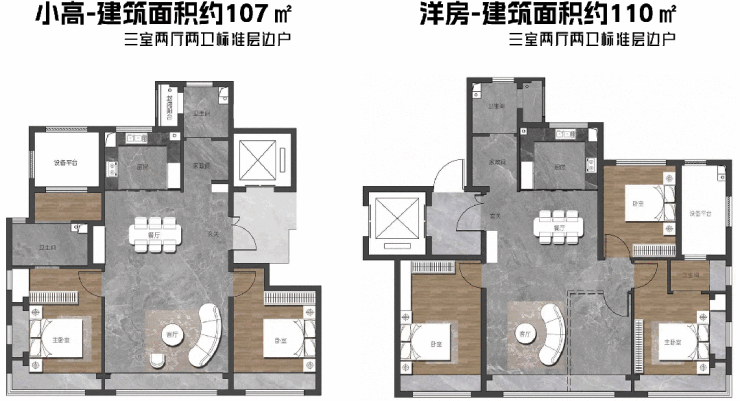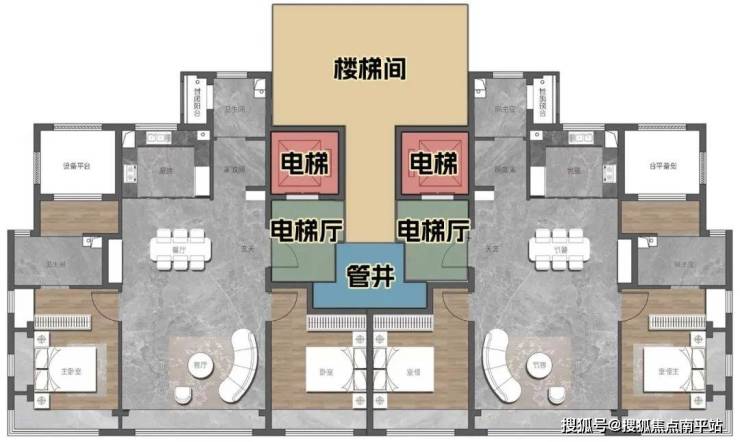 建筑面积约107㎡的小高层户型,采用了「两梯两户纯板式架构」,彻底告别传统两梯四户带连廊设计。