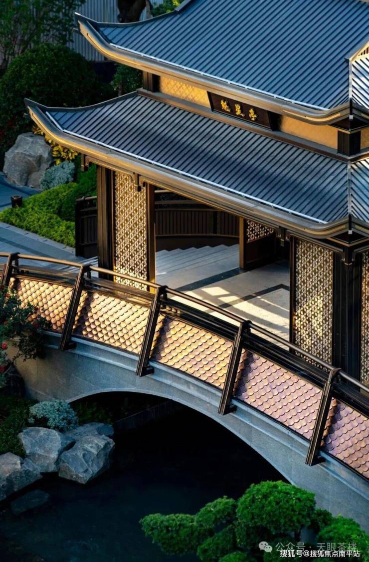 穿过月洞门,豁然开朗之处,复刻朱熹文公书院的魁星阁临高而立。魁星执笔点斗,暗喻金榜题名,以文脉之最传续书香世家。龙鳞金瓦桥横卧瀑前,约6米高差引水成瀑,山石为伴,气象万千——这处 岛内最高的下沉式瀑布中庭,将自然山水浓缩于方寸之间,创造了“居尘而出尘”的诗意栖居。