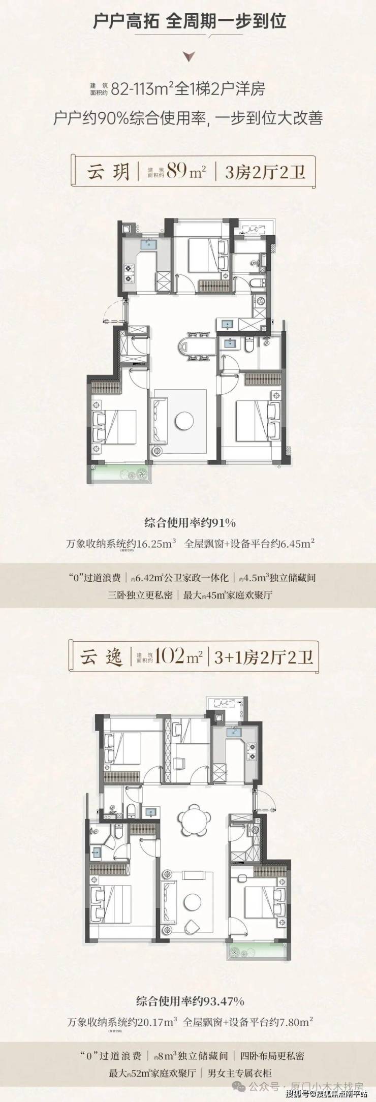 - 空间能打:90%+得房率让小户型也有强功能性,89㎡三房两卫、113㎡四房两卫,性价比突出。