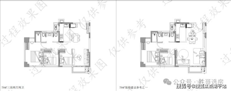 高层79m²户型三房两厅两卫,综合使用率约85.8 %,空间及功能堪比市面 100㎡以上二手房,相较新房有10㎡左右的降维打击,相当于89㎡左右新房。