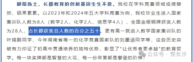 以2023年和2024年五大学科竞赛为例,该校毕业生进入国家集训队人数为 8人,全国金银铜牌获奖人数为 28人,占长郡集团获奖总人数的 50%。