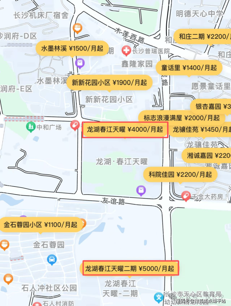 以及天心区的龙湖春江天曜,本身不配套学校,但因为距离学校近,租金在4000-5000元/月,远超周边市场。