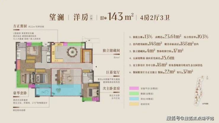 户型设计以实用为导向:103-126㎡四房两卫,143㎡三卫改善型,得房率均超市场平均水平。