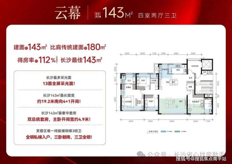 ——约19.2米南向全景视野 比肩传统建面约180㎡户型 得房率约112%(含私梯厅)