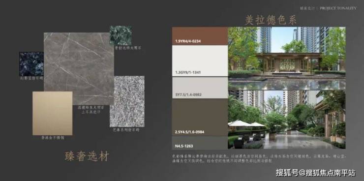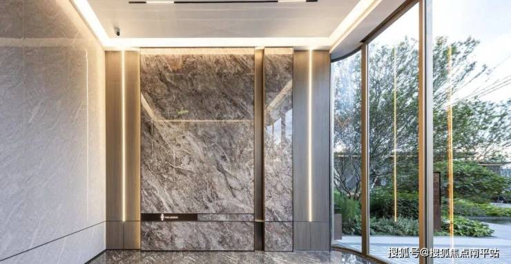 · 单元入户——单元门以温德姆灰石材+紫山水石材+香槟色金属作为主要材质,迎宾景墙墙面地面用大板砖、威尼斯棕整面岩板加以香槟色金属和灯带装饰,增加了高级感