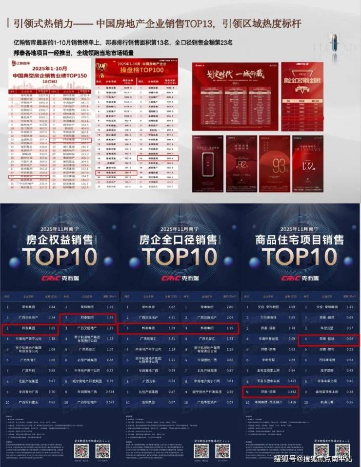 2025年1-9月销售面积排行全国房企TOP14,销售权益金额全国TOP24。南宁邦泰璟和项目2025年1-5月单盘排行南宁市销售额TOP1,热销全城。(数据来源亿翰智库)