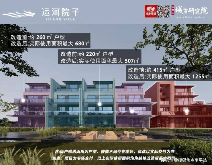 其中,运河院子建面约415㎡户型,实际使用面积最大达 约1255㎡。 (注:每户赠送面积因户型、楼栋不同存在差异,具体以实际交付为准。)