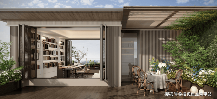 四楼连接书房的是一个超级星空露台,在这里,进可文艺,退可居家,将露台打造成空中花园、茶室、健身房、书房等多种生活场景,实现真正意义上的空中“百变场域”。
