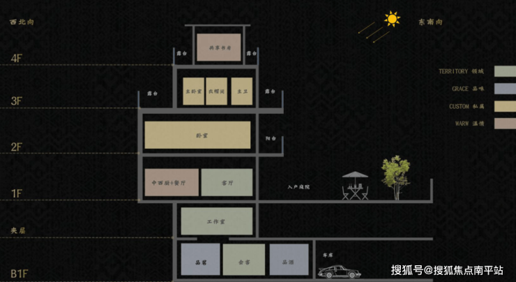以建面约260㎡的户型为例,算上B1与夹层, 一栋五层半,可拓展成领域空间、品味空间、温情空间,即使是多代同堂的大家族,也能够做到分层而居,合而不扰。