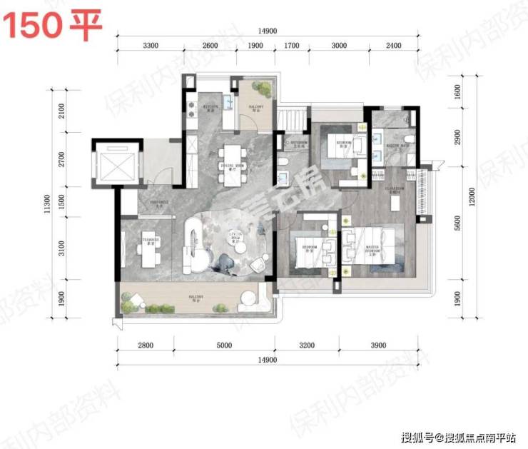 150平方米四房及172平方米户型为数量最多的主力户型,分别有约133套和138套。150㎡户型双阳台对流,客厅开间达5米,超豪华主卧套房,带270°无柱飘窗。