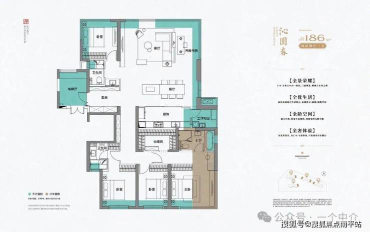 186㎡(楼王四房):得房率约105%(有独立电梯厅和开阔河景)
