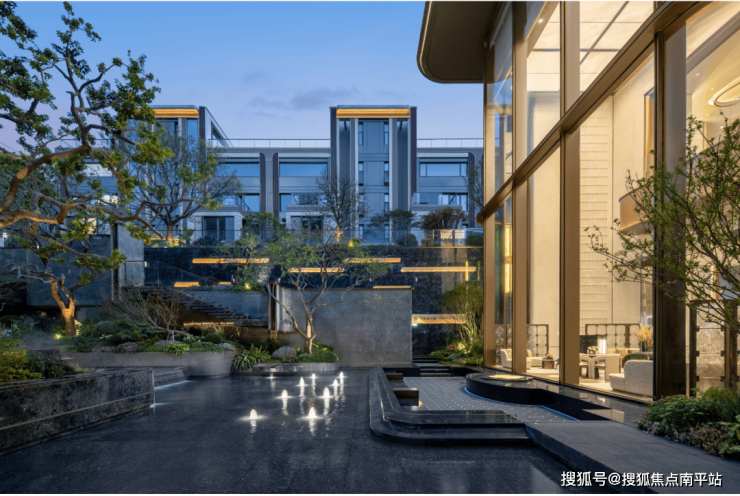 整个门厅以精致的陶瓷质感与石材相互交织。进口约百年罗汉松,树高有4.5米,形成天然的“绿色穹顶”,搭配巴西进口的宇宙金奢石水景,自带金白相间的天然纹理,像是星河倾泻,添了几分柔情。