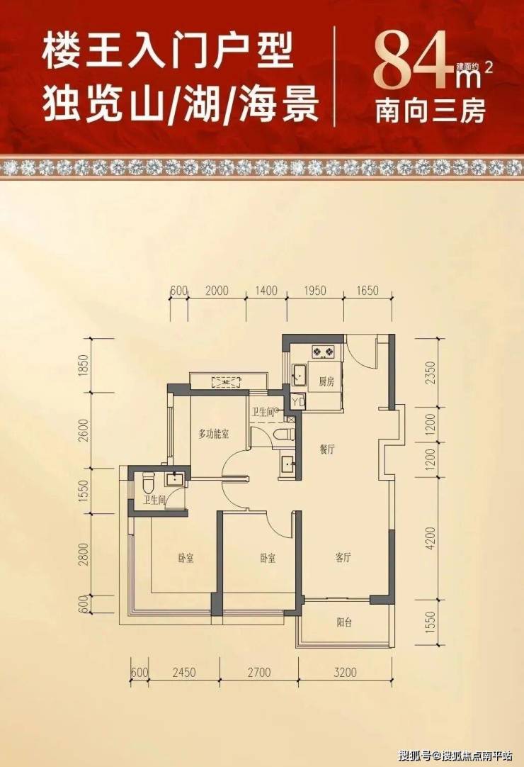 84㎡的3房2厅1卫,设计的是竖厅格局,客厅3.2米开间,LDKB一体化,S墙设计预留冰箱卡槽位,3个卧室分别做到了主卧10.37㎡/次卧9.18㎡/次卧7.54㎡(包含墙体飘窗),U型厨房,卫生间三段式分离,得房率约77%(不含赠送),东南或者西南朝向。