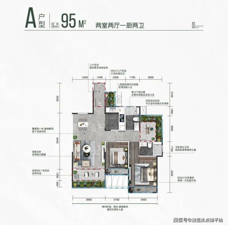 95㎡三房,入户玄关带收纳空间+约5平入户花园,餐客阳一体,开间约3.8米,空间尺度开阔,尤其阳台带花池,进深约2.1米,双南向卧室很大,尤其是主卧套房,面积月20㎡。