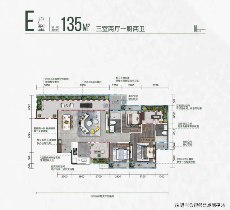 135㎡做到了6房,是 123㎡的plus版,大横厅开间约7.3米,主卧套房多一个灵动空间,可作为书房或休闲、娱乐空间。