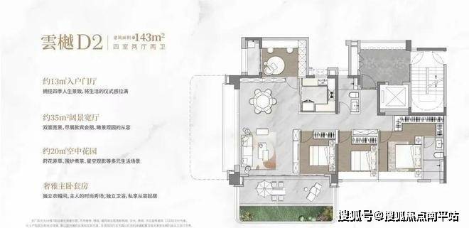 143平4房四代宅:主卧带独立衣帽间,南北双景,约20平空中花园,院墅级生活场景!