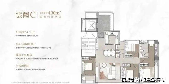 110平4房2卫:独立电梯厅,270度采光前厅,约20平主卧+270度全景舱,布局4房毫无违和感!