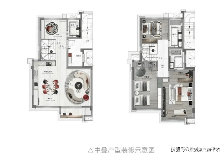 【中叠】约达15.4米总户开间设计 ,打造了客餐区嬉戏、主次卧休憩、楼上楼下分层生活场景,形成了一种私密且舒适的居住环境,真正做到了空间与生活的融合,满足一家人对功能的所有想象。