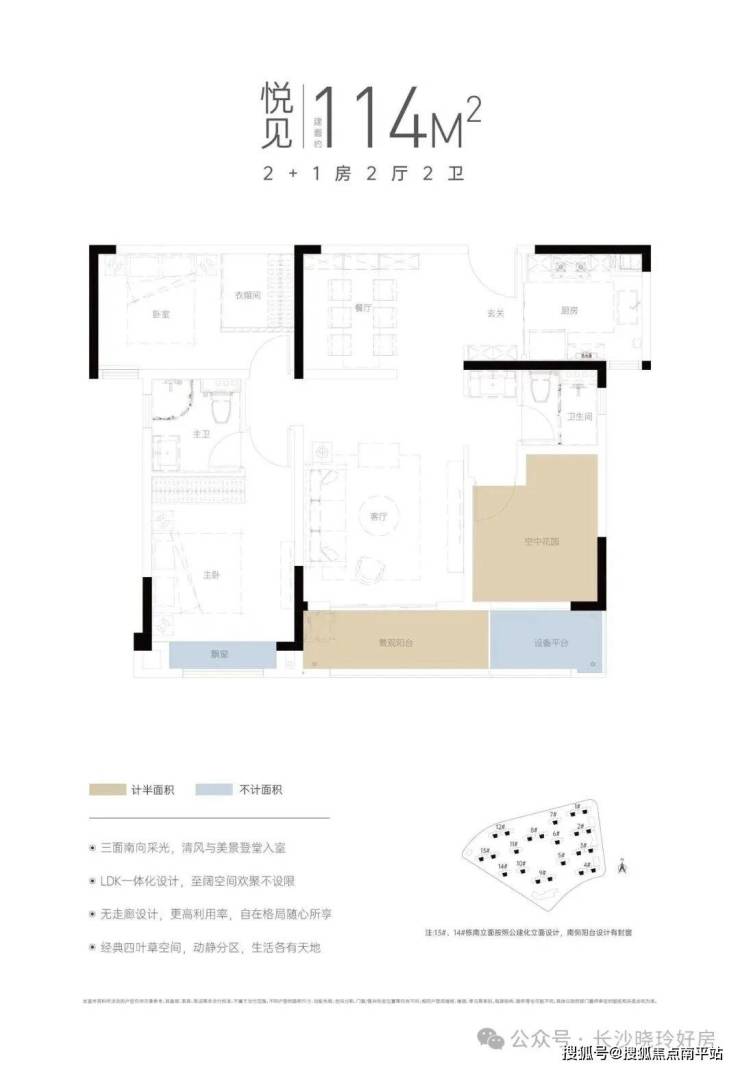 ·建面约114㎡2+1房,三开间朝南,充分考虑家庭成长与均好需求,主次卧开间皆超3米,客餐厅等面宽,营造约30㎡餐客一体空间,各功能区尺度均衡,南向景观阳台开间约6.8米(含设备平台),实现小户型大空间